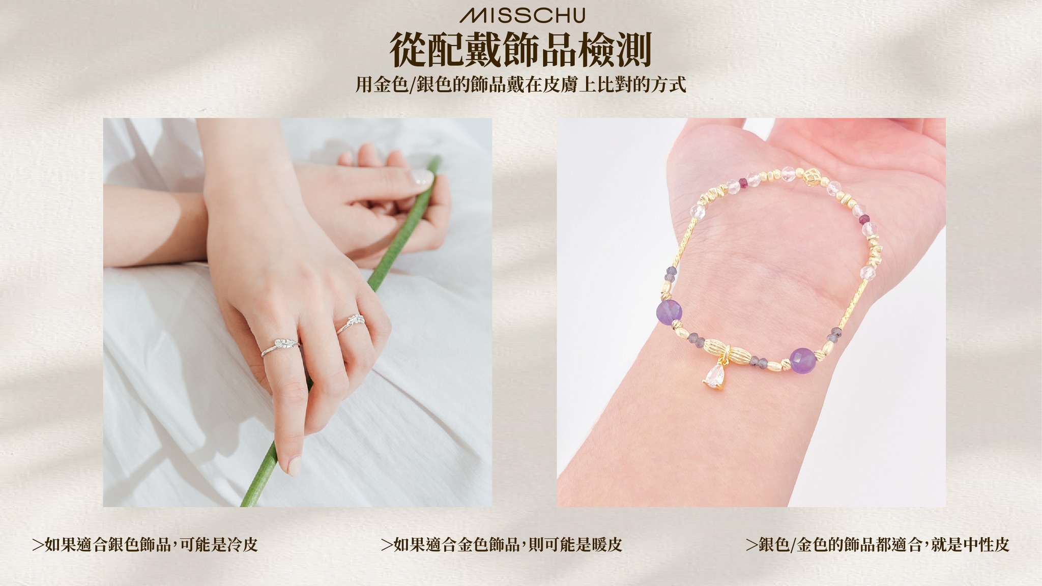 >若佩戴金飾飾品看起來有明亮效果,則屬於暖皮