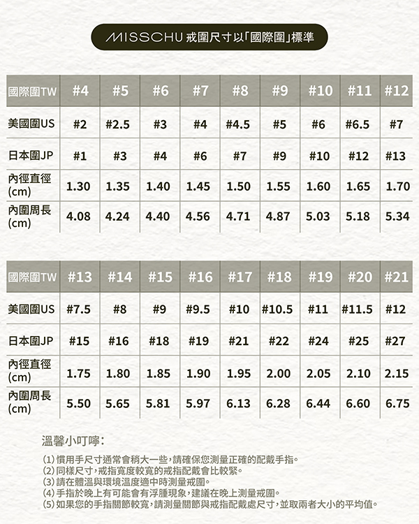 為確保您的戒圍號碼是能夠舒適配戴的,如果可以,雖然麻煩一點,但建議還是盡量去附近銀樓或是珠寶店請他們為您測量您的「國際戒圍」號碼,因為他們有專門測量「國際戒圍」的戒圈,能讓您實際配戴出您舒適的號碼。自己測量也可,但容易有誤差。